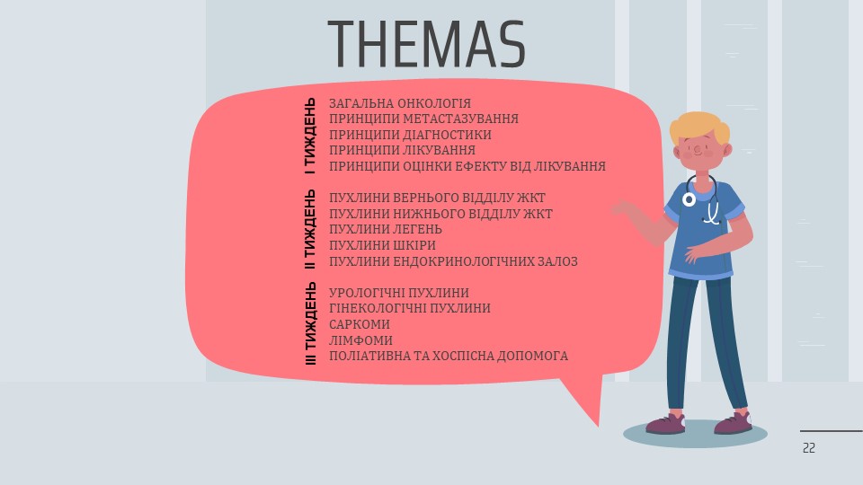 Перша – інформаційна. Вона створенна, як підручник з усією інформацією щодо загальної та профільної онкології. З першого дня на вас обрушиться шквал інформації, а для її запам’ятовування ми розробили теоритичну частину, в якій є всі ті теми, що ми розбираємо на заняттях.